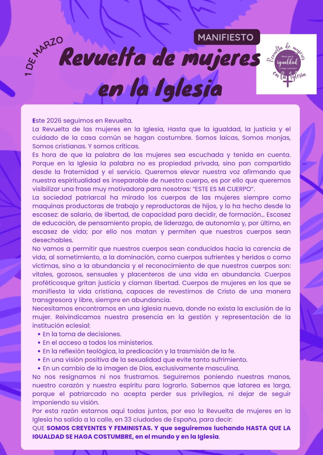 das Mulleres na Igrexa de Galicia publicaba un comunicado (https://forms.gle/KaUK5xh48ogxeBqu6 ) en el